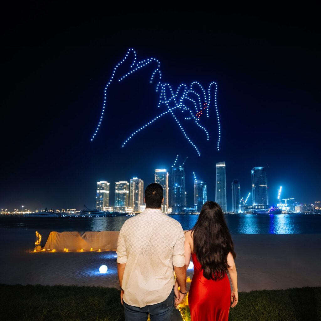 Let hundreds of drones light up the Dubai sky in a breathtaking aerial love story, from the first spark to the unforgettable “Yes.” Set above desert dunes or by the sea, this 15-minute spectacle blends personalized visuals, animations, and symbols into a proposal written in the stars, crafted with emotion, elegance, and cinematic flair.