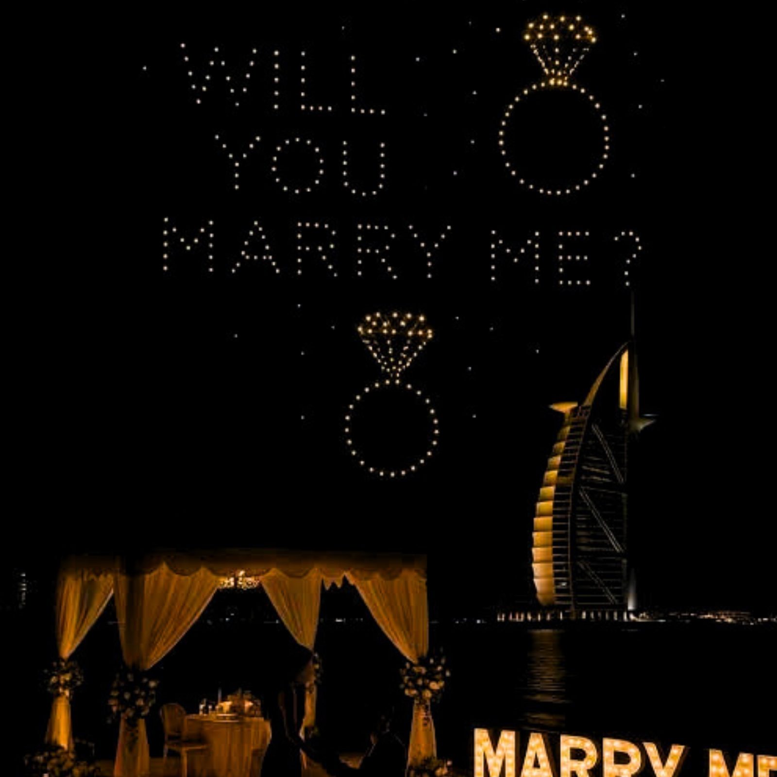 Let hundreds of drones light up the Dubai sky in a breathtaking aerial love story, from the first spark to the unforgettable “Yes.” Set above desert dunes or by the sea, this 15-minute spectacle blends personalized visuals, animations, and symbols into a proposal written in the stars, crafted with emotion, elegance, and cinematic flair.