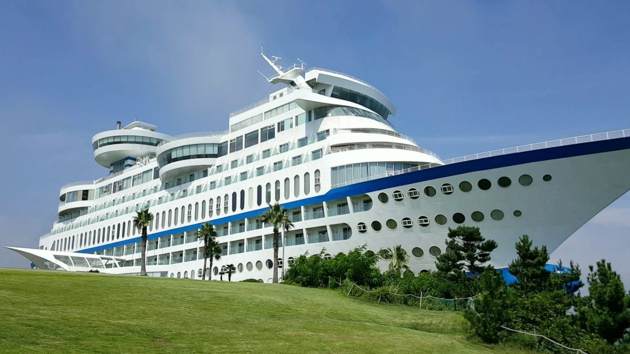 Love traveling oceans, but seasickness is holding you back? The Sun Cruise Resort & Yacht, the world’s first on-land cruise themed resort is here to give you the timeless cruise experience on the ground. Situated on a coastal cliff in Jeongdongjin, a famous tourist destination known for having a standout sunset view in Korea, the themed retreat gives the feeling that a journey ship has steered aground.