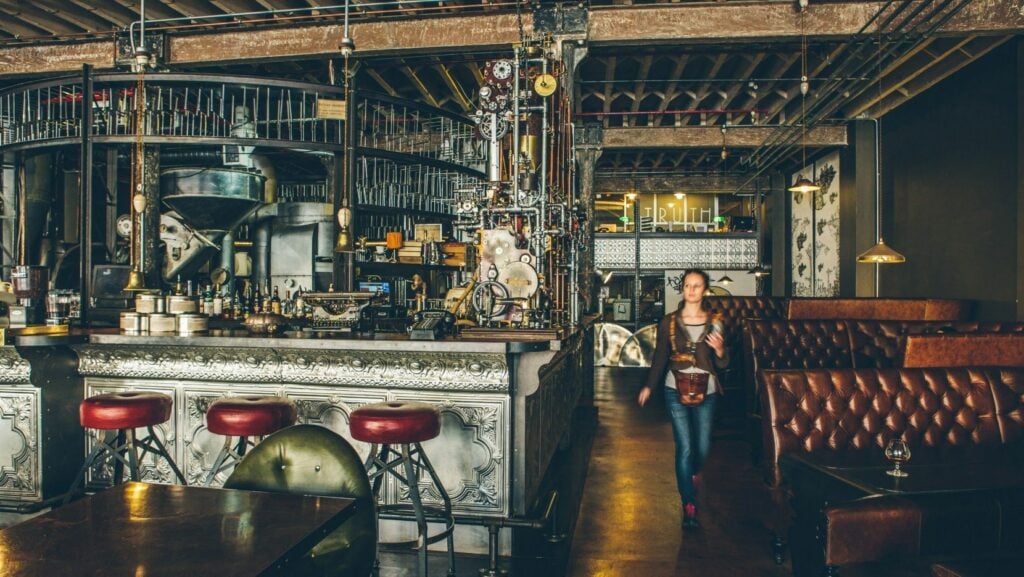 Steampunk Roaster and Café – designed by Haldane Martin is one of the largest roaster cafés in Cape Town, South Africa. The unique rustic and vintage interior of the space is what makes it so dazzling. The design focuses around a cast iron vintage roaster drum; the cast iron gives off radiant and convective heat making for a stronger flavored coffee than other coffees brewed in the more common steel drums introduced in the seventies, and it is this attention to detail that is key to this coffee joint.